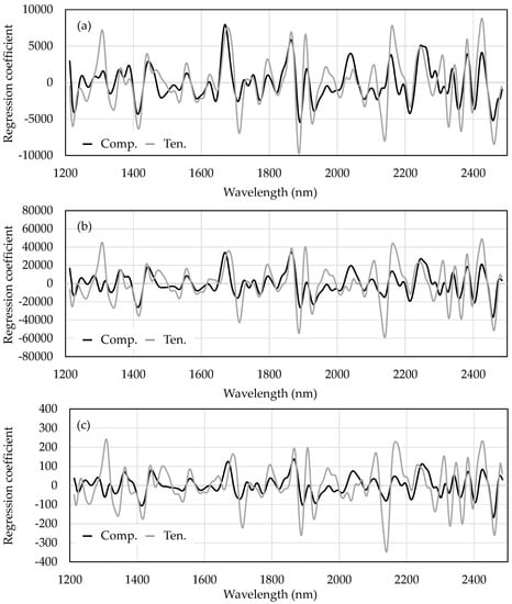 Regression coefficients for the PLSR predicting Eb (a); Fb (b) and DEN (c) calculated from the pretreated NIR spectra. Black line indicates the compression force (Comp.) and the gray line indicates the tensile force side (Ten.).