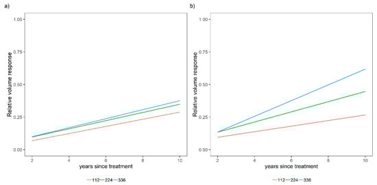 All the coefficients are significant at alpha = 0.05 and display proper signs. The fitted Equation (16) implies that the stand-level relative volume response increases with higher levels of N and the relative volume response is higher when N and P are applied together. Lower site qualities, represented here by the site index, also display higher relative volume responses for any fertilization practice compared to sites with higher quality. The relative response increases over time for any treatment, and the relative response increases for stands with higher RS, which means that more growing space (lower competition for nutrients x water x light) is available for the trees.