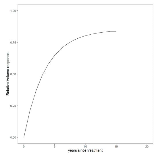 where rV is the relative volume of treatment x at t years since the treatment was established; is the stand-level volume of treatment x at the time when the treatment was established (t = 0); and other variables are previously defined.