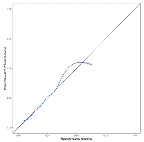 Performance of Equation (16), smooth line of observed stand-level relative volume responses vs. estimated (predicted) stand-level relative volume responses. The validation dataset originated from 1000 random samples generated through the non-parametric bootstrapping technique.