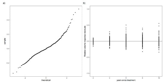 Equation (8) still displays some shortcomings. The relative volume response is typically higher at sites with lower quality; however, site quality is not represented in the equation. In our dataset, large differences in the initial stand density exist ranging from 551 to 2059 trees ha−1, as shown in Table 3, which are not represented in the equation.