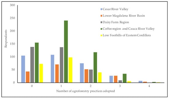 The agroforestry practice most widely adopted is forest, by 50.9%. Among the reasons explaining the adoption of this practice were the benefits provided. Wood from the forest is used as a source of fuel, as input for the construction of house and livestock infrastructure, to produce revenues derived from selling timber, and for the preservation of watersheds and streams. Another factor that influences the wide adoption of forest is the low cost of establishment and handling associated with natural regeneration after human intervention [59]. This is consistent with the fact that the intensity of use of inputs (labour and capital) influences the adoption of technologies in farming systems [60,61]. The second-most adopted agroforestry practice is scattered trees (22.6%) established with different purposes, such as the production of fruit, rubber, or wood; as sources of forage; and protection of cattle from the sun and high temperatures, especially in warm areas, where cattle are more likely to suffer from heat stress [62]. The less-adopted agroforestry practices are forage from trees and shrubs and forestry plantations (18.4% and 12%, respectively), given that both require the use of certain species of plants, seeds, or plant material for the establishment, and they are associated with additional management, especially to protect plants from being ingested or trampled by cattle until they reach the proper size, which implies a higher level of complexity in the management of the practice, constraining adoption [44].