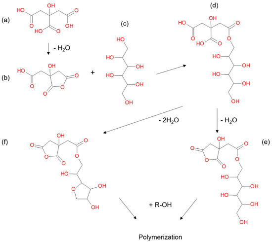 Polyesterification of bio-based chemicals in wood as an impregnation chemical modification technique is a field which has been gaining research attention over the past decade [5,6,7,8,9,10,11,12,13]. One promising method utilising relatively low-cost chemicals is polyesterification using sorbitol and citric acid (SCA) [14,15]. The uncatalyzed reaction of citric acid with alcohols or polyols is thought to proceed through a cyclic anhydride intermediate formed by dehydration of the citric acid (Figure 1a,b) which then reacts with a hydroxyl group in the alcohol/polyol (Figure 1c) to form an ester (Figure 1d) [16]. Doll et al. [17] proposed that the polymerization reaction for citric acid and sorbitol continues by further condensation reactions in the initial ester to form an additional cyclic anhydride (Figure 1e) and/or anhydrosorbitol ring (Figure 1f) and then further condensation reactions with hydroxyl groups form a polyester. Centolella and Razor [18] demonstrated the formation of a polyester from citric acid and sorbitol for use as an additive in food products. SCA polyesters have also been explored for application as controlled release hydrogels [19], biomedical tissue scaffolds [20], antiscalants in detergents [21] and surface coatings [22].