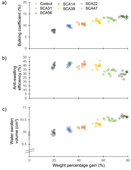 Dimensional changes in sorbitol citric acid modified wood as a function of weight percentage gain. (a) Bulking coefficient; (b) Anti-swelling efficiency; (c) Water swollen volume—note the broken y-axis.