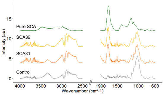 ATR-FTIR spectra prior to leaching are shown in Figure 3. The pure SCA polymer spectra contains a large peak at 1730 cm−1, assigned to C=O stretch in ester groups [43,44,45]. The same peak is visible in the SCA31 and SCA39 spectra, indicating the formation of ester bonds in the SCA-modified wood. The lignin peak at 1508 cm−1 appears to be unchanged by the modification while the broad hydroxyl peak at 3350 cm−1 is reduced in SCA31 and SCA39 compared to the control samples.