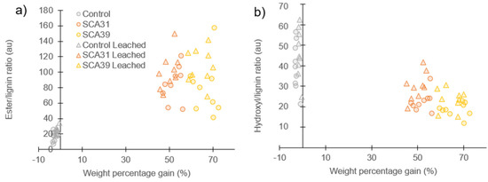 Peak area ratios were used to quantitatively compare the ATR-FTIR results for control and modified samples before and after leaching (Figure 4). The plot of ester/lignin peak ratios (Figure 4a) clearly shows the increase in ester groups in SCA-modified wood compared to controls, both before and after leaching. However, linear regression models gave poor correlations between WPG and ester/lignin ratio (non-leached R2 = 0.60, leached R2 = 0.81). Furthermore, a paired t-test between ester/lignin values before and after leaching for SCA31- and SCA39-modified samples showed an insignificant effect of leaching (p > 0.05). Although leaching led to 1.7% ± 0.2 and 1.3% ± 0.3 mass loss for SCA31 and SCA39, respectively, this does not appear to have affected the intensity of the ester peak in the ATR-FTIR spectrum.
