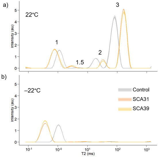 Low-field nuclear magnetic resonance T2 relaxation time distributions of control, 31% sorbitol citric acid and 39% sorbitol citric acid modified samples. Solid dark lines represent average distributions for four replicates for each treatment and lighter shading shows the standard deviation. (a) measurement at 22 °C; (b) measurement at −22 °C.