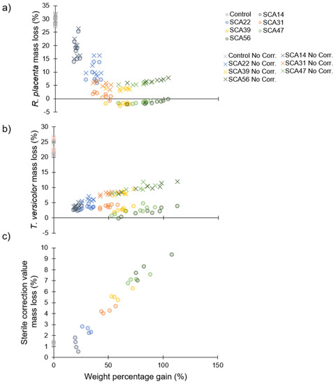 Mass loss of sorbitol citric acid modified wood as a function of weight percentage gain after eight weeks of exposure in modified EN 113 experiment. (a) Incubation with Rhodonia placenta; (b) Incubation with Trametes versicolor; (c) Sterile samples incubated without fungus used as correction values. Corrected mass loss values in (a,b) are shown with circles while uncorrected values are shown with exes.