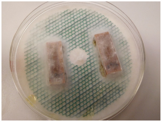Resistance to fungal decay as a function of modification intensity is shown in Figure 6. Panels (a) and (b) show mass loss due to R. placenta and T. versicolor degradation, respectively. Green circles show values which have been corrected by reducing the mass loss by the average mass loss during sterile incubation without fungi for the corresponding treatment level (Figure 6c) [58]. Red Xs represent mass loss values with no correction. The large difference between the corrected and uncorrected values for higher levels of modification results from the larger correction values for these treatments (Figure 6c). For brown-rot by R. placenta, there appears to be a protection threshold around 50% WPG at which point mass loss due to fungal degradation is reduced to zero. Although no mass loss (accounting for correction values) was observed for the highest treatment levels, droplets of yellow liquid formed in the petri dishes for the R. placenta samples incubated with the SCA47- and SCA56-modified wood (Figure 7). The white-rot T. versicolor seems to be more aggressive towards the SCA-modified wood and even at the highest WPG levels some mass loss is observed, though values are much lower compared to unmodified samples.