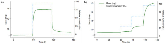 Sorption behaviour of pure SCA polymer. (a) Deuterium exchange experiment; (b) adsorption isotherm; Both measurements conducted at 25 °C. The solid green line shows sample mass and the dotted blue line shows relative humidity. Note the secondary y-axis and the broken primary y-axis.