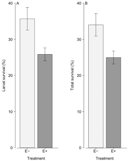 Mean (±SE) larval (i.e., second instar to pupa) (A) and total (i.e., second instar to adult emergence) (B) survival of eastern spruce budworms reared on white spruce trees. Thirty-two trees contained a native endophytic fungus (E+, dark bars) and 32 control trees did not (E−, light bars).