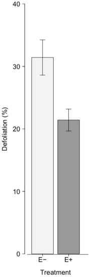 Mean (±SE) defoliation of white spruce trees by eastern spruce budworm. Thirty-two trees contained a native endophytic fungus (E+, dark bars) and 32 control trees did not (E−, light bars).