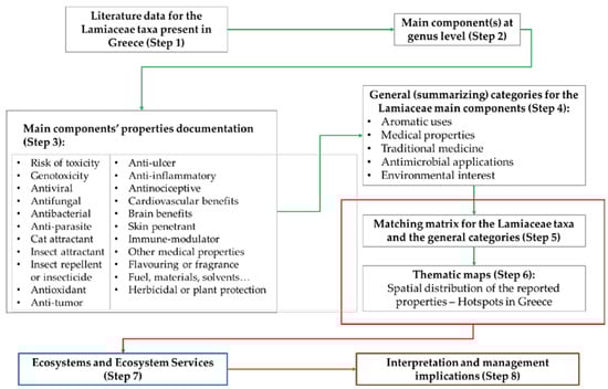 The Lamiaceae taxa present in Greece and their status as Greek endemics and/or range-restricted are identified and designated following Dimopoulos et al. [,] and the related Flora of Greece Web database portal []. In the present study, taxa are defined as comprising species and subspecies. Separation of the terrestrial Greek territory into floristic regions follows Strid and Tan [] and the specific biogeographical region names are used. The implementation of the study consists of the following eight steps (Figure 1):