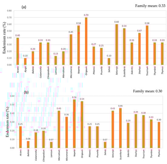 - Genus level: Origanum is characterized by the highest endemism rate (70%) with 7 endemic species out of 10, followed by Satureja (60%), Nepeta and Teucrium (58%) (Figure 2a). Nepeta presents the highest rate with 10 endemic taxa out of 18 (56%), mostly due to the numerous endemic Nepeta argolica subspecies, followed by Origanum (54%) and Scutellaria (46%) (Figure 2b).