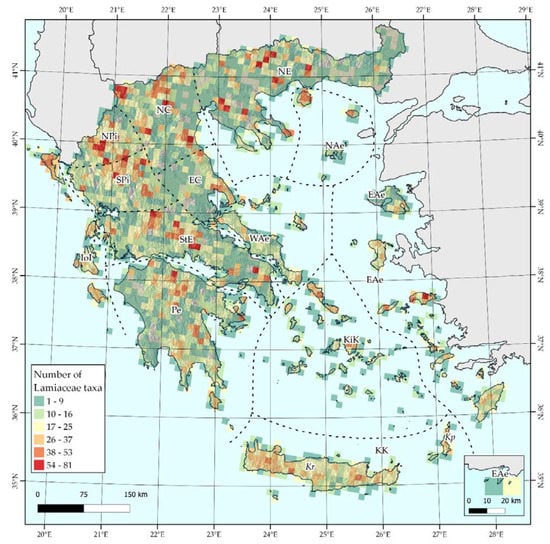 Distribution of the Lamiaceae taxa in Greece (10 × 10 km, EEA reference grid). Dotted lines delineate the floristic regions of Greece [].