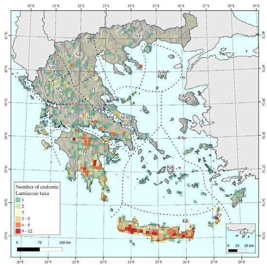 - Hotspot regions of Lamiaceae endemics are located on the Kriti (Kr) and Karpathos (Kp) islands and in Peloponnisos (Pe), especially in the southeast part of the region; Mt Athos (NE) can also be considered as a local hotspot (Figure 4).