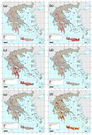 The thematic representation of the spatial distribution of each general property category per endemic taxon is depicted in Figure 5a–e; five gradient maps, one for each general property category, have been drafted, where the different hotspots are visible, according to the presence of endemic plants of interest for each property. The results of the analysis per category are as follows: