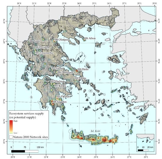Step 7: Correspondence to the Common International Classification of Ecosystem Services (CICES ver. 5.1) [] sections (i.e., Provisioning, Regulating and Maintenance, Cultural) and the relevant codes is also presented and assigned to the relevant categories of the IPEBS [], Millenium Ecosystem Assessment (MA) [] and TEEB []. Ecosystem types supporting these ES are highlighted and ES bundles regarding the identified ES are depicted in thematic maps;
