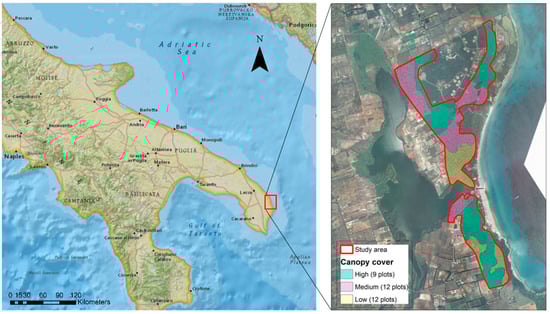 Fieldwork took place in 2006, aimed at characterizing the forest stands and the development of the associated understory. With that purpose, we installed 33 circular sampling plots, with a diameter of 30 m, distributed across the study area, trying to evenly cover the whole range of understory developmental stages. This was achieved by estimating in the field the height of the plant community to obtain a balanced distribution of plots for different height classes. This procedure resulted in the following plot distribution by average height class: <30 cm, six plots; 30–39 cm, six plots; 40–49 cm, six plots; 50–59 cm, eight plots; ≥60 cm, seven plots. We did not collect the geographical coordinates of each plot, but an approximate location of the sampling sites allowed us to produce the map shown in Figure 1. This map shows three classes of canopy cover (low, medium, high), obtained by photointerpretation of orthophotos from the Apulia Region dated from 2006, using ArcGIS 10.7.1, (ESRI). We then estimated the approximate number of plots that were established within each patch of canopy cover. Plots were regularly spaced, as much as possible, across the study area and were always away from the edges of the pine stands.