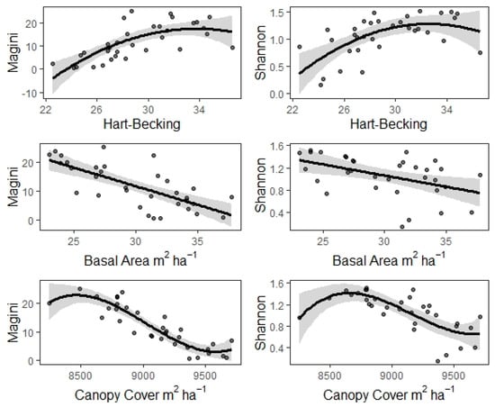 Polynomial fits and respective 95% confidence intervals for the Magini and Shannon indices as functions of the Hart–Becking spacing index, Basal Area and Canopy Cover. Dots represent the 33 sampling plots.
