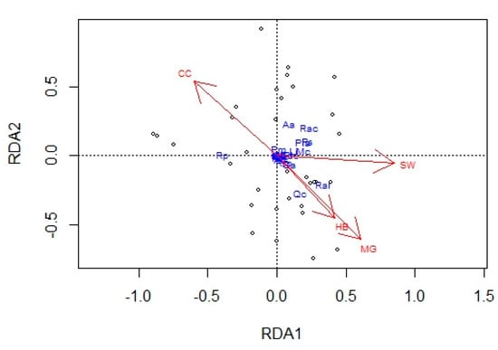 Based on the permutation tests, we chose the Canopy Cover, the Hart–Becking index, the Magini index, and the Shannon index for the final model. The model was significant at p < 0.001 and so were both axes (p < 0.001 for RDA1 and p = 0.036 for RDA2). The unadjusted R2 was 0.32, with the first two axes representing 18% and 8%, respectively, of the total explained variance. The adjusted R2 was reduced to 0.23. The RDA tri-plot confirmed the results obtained by the LMM analysis, showing that the Hart–Becking index had a high positive correlation with the Magini index and a high negative correlation with the Canopy Cover (Figure 3). The inclusion of highly correlated variables is often avoided in ordination methods such as PCA and RDA []. However, just including the two least correlated variables (Magini and Shannon) yielded results very similar to those obtained with our chosen model. The Shannon index was very aligned with the second axis, RDA2. Some species were associated with higher diversity levels, including Asparagus acutifolius and Ruscus aculeatus, but these species were quite indifferent to structural changes in the under- and the overstory. On the other hand, two late-successional species, Quercus coccifera and Rhamnus alaternus, were positively associated with the Magini and Hart–Becking indices. In general, most species presented scores positively associated with understory development, species diversity and tree spacing. The most important exception was the widespread climber Rubia peregrina, apparently associated with lower species diversity.