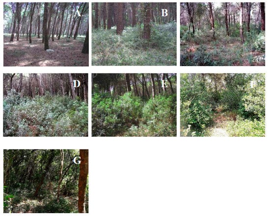 Images (A–E) were taken in 2006, in the afforested area, showing an increasing development of the understory, associated with decreasing levels of canopy cover. Image (F) was taken in 2019, showing the transition from understory to overstory. Image (G) was taken in 2019 in a nearby reserve not afforested with P. halepensis, where ecological succession along 40 years has resulted in the development of a broadleaf forest dominated by Quercus coccifera, Quercus ilex and Arbutus unedo.