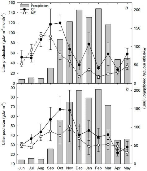 Mean (±95% confidence interval; n = 6) monthly rates of litter production (a) and litter pool size (b) presented as dry mass per unit area (gdw m−2) for the seasonally flooded cerrado forest (CF: closed symbols; solid lines) and the upland mixed forest (MF: open symbols; dashed lines) during the 2014–19 study period. The solid bars in both panels are the average monthly rainfall for the same period.