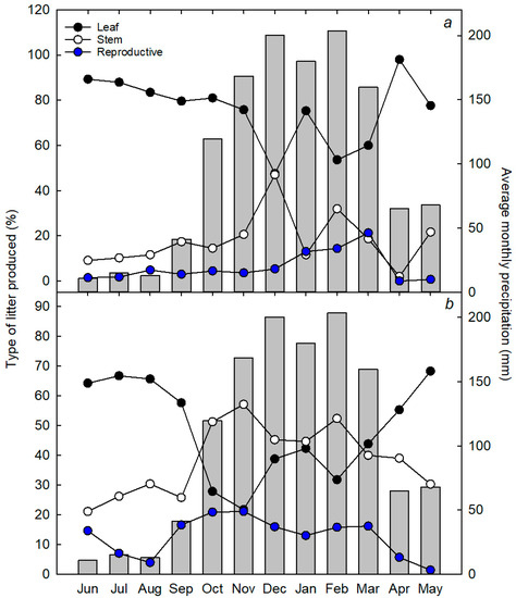 More than 50% of all litter produced in the cerrado forest consisted of leaf litter, followed by stem and reproductive litter (Figure 2a). Leaf litter was the dominant form of litter produced during the dry season (June–September) and during the wet-dry season transition (March–May), while in the wet season, stem litter production either equaled or exceeded leaf litter production (Figure 2b). As a result, leaf litter production was negatively correlated with precipitation, while stem litter production was positively correlated with precipitation (Table 1). Reproductive litter was positively correlated with precipitation for the cerrado forest but not the mixed forest (Table 1) even though reproductive litter production was generally higher in the wet season for both forests (Figure 2). On average, leaf litter accounted for 76% and 49%, stem litter accounted for 18% and 39%, and reproductive litter accounted for 6% and 12% of the total litter produced in the cerrado and mixed forests, respectively.
