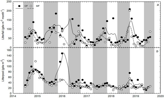 Mean monthly rate of total litterfall (a) and litter pool mass (b) presented as dry mass per unit area (gdw m−2) for the seasonally flooded cerrado forest (CF: closed symbols) and the upland mixed forest (MF: open symbols) during the 2014–19 study period. The shaded areas depict the dry season (precipitation < 100 mm/month) and the solid and dashed lines depict a three-month running average for the cerrado and mixed forests, respectively.