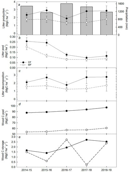 Mean (±95% confidence interval; n = 6) annual litter production and precipitation (a), litter pool mass (b), decomposition rate (c), and total aboveground wood C pool size (d) and aboveground wood C storage (e) for the seasonally flooded cerrado forest (CF: closed symbols, solid lines) and the upland mixed forest (MF: open symbols, dashed lines) during the 2014–19 study period.