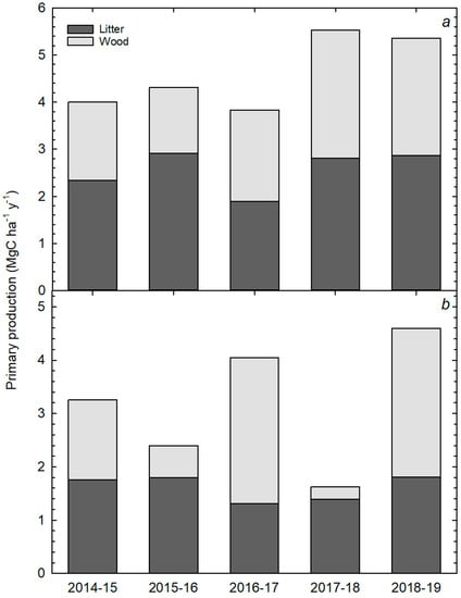 Aboveground net primary production (ANPP), calculated as the sum of the annual wood C storage and litter production, varied between 3.8–5.5 MgC ha−1 y−1 for the cerrado forest (Figure 5a) and 1.6–4.6 MgC ha−1 y−1 for the mixed forest (Figure 5b). The highest rate of ANPP was observed in 2018–19 for both forests, while the lowest rate of ANPP was observed in 2016–17 for the cerrado forest and 2017–18 for the mixed forest. While temporal patterns and rates of ANPP were different for each forest, the percent contribution of litter production and wood C increment to the total ANPP was remarkably similar for both forests: 56% and 43%, respectively (Figure 5).
