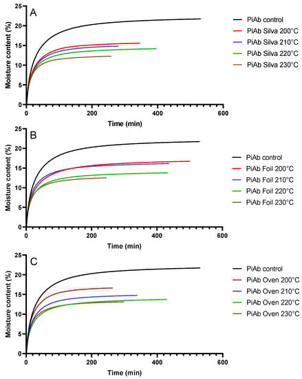 Dynamic vapor sorption (DVS) sorption curves of Norway spruce (PiAb) wood modified according to different procedures: Silavapro (Silva) (A); modification of samples wrapped in aluminium foil (foil) (B); modification that took place in an ambient atmosphere in the oven (oven) (C).