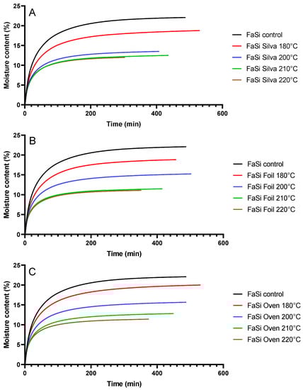 DVS sorption curves of European beech (FaSi) wood modified according to different procedures: Silavapro (Silva) (A); modification of samples wrapped in aluminium foil (foil) (B); modification that took place in an ambient atmosphere in the oven (oven) (C).
