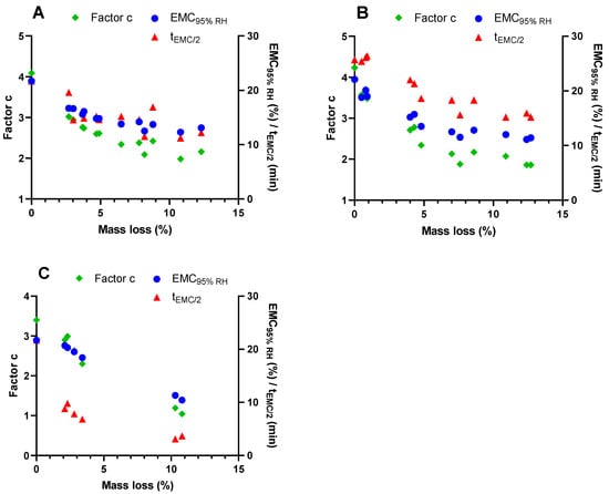 After the DVS analysis, equilibrium moisture content at 95% RH (EMC95% RH), the time needed to reach equilibrium state (t95% RH), the time needed to reach the half value of the equilibrium moisture content (tEMC/2), and the time required to reach 10% moisture content (t10% MC) were determined. Additionally, graphs were made; the measurement time was plotted on the abscissa, the moisture content was plotted on the ordinate, and an elongation factor, c, was derived from the logarithmic function y = c × ln(x) + b. Only the first 800 measurements were considered for the calculations.