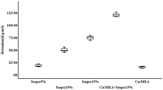 Populus deltoids was chosen for this study because it is used prevalently in a wide variety of applications in Asia, Europe, and America. The majority of this wood is used for energetic purposes, composites, veneers, packaging [34]. However, the industry is looking for applications with higher added value as well, such as furniture, decking, etc. If poplar wood is to be used in more exposed applications, it has to be protected to limit fungal decay [39]. The retention of preservatives is the first substantial factor that shows the quality of the impregnation. Retention of the active ingredients increased with increasing resin concentration (Figure 1). Namely, wood treated with the lowest concentration of resin retained 18.4 kg/m3 of the resin, while the samples that were treated with the highest concentration of the resin system, took up 74.5 kg/m3 of the resin. It seems that ethanol solution has sufficient viscosity that enables good penetration into wood. ANOVA test results indicated that there was a significant difference between the retention of preservatives at the 99% confidence interval (p < 0.01) (Table 2). Duncan’s test classified the value of retentions into four groups.
