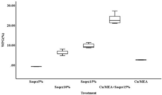 Wood retention data were in line with WPG data. In general, WPG increased with increasing resin concentration. Similarly, as reported for retention data, the highest WPG was determined in samples treated with copper-ethanolamine solution subsequently treated with resin (Figure 2). High WPG can be ascribed to the reaction of copper-ethanolamine complexes with wood and resin [42]. However, negative WPG was determined in samples treated with the lowest concentration of the resin. This can be ascribed to the fact that there might be some extractives leached from wood during impregnation with the ethanol-based solution. Besides, part of the resin might evaporate from the wood during oven drying. Predominately, the melting point of the resin was rather low. The melting point was between 50 °C and 60 °C. ANOVA test results showed that there was a significant difference between the WPG of samples (p < 0.01) (Table 3). Duncan’s test classified the value of WPG into five groups.