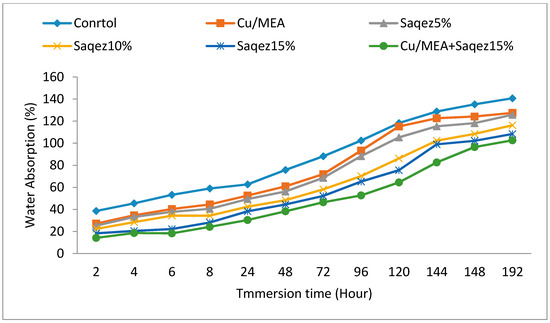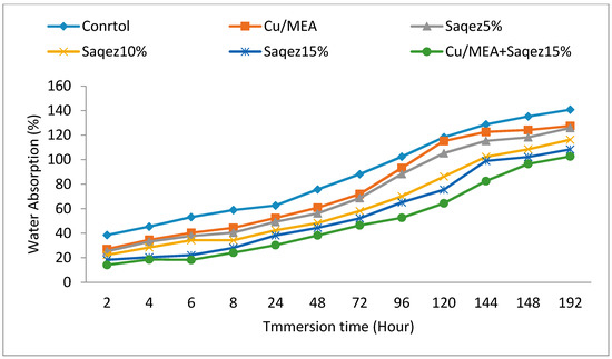 Water absorption and volumetric swelling tests were carried out by soaking the treated and untreated samples for 2, 4, 6, 8, 24 h, and repeated at 24 h intervals at room temperature following ISO 13061:2016 [36]. The water was replaced with fresh. Water absorption and volumetric swelling were evaluated according to Equations (3) and (4), respectively: