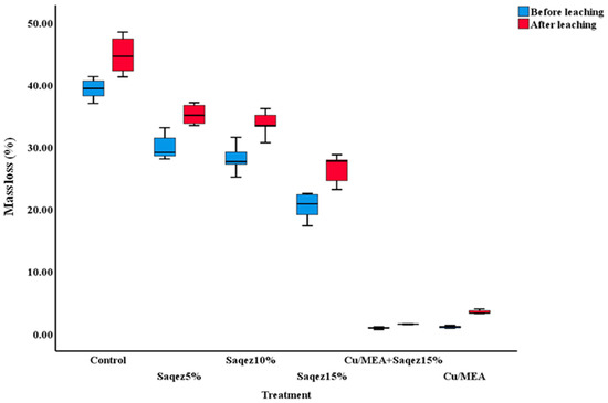 One of the prime objectives of this study was to determine the performance of the respective treatment against wood decay fungi. Samples were exposed to white-rot fungi. White rot fungi are the most important organisms degrading hardwoods [45]. Mass loss of the leached and unleached samples was rather high, ranging between 39.3% at non-leached and 44.8% at leached specimens (Figure 5). These data are in line with the low durability classification of poplar wood [35]. Resins have a limited effect on the fungi. Mass loss of the Saqez treated samples was a bit lower than the mass loss of the controls. The efficacy of the resin increased with increasing concentration of resin in the treatment solution. For example, the mass loss of the wood treated with 5% ethanol solution of Saqez was 30.1%, whereas the mass loss of the wood treated with a similar solution with three times higher concentration was 20.4%. This mass loss was higher than the mass loss of the comparable oil or wax-based systems [12,46]. The major constituents in the Saqez are α-pinene (60.15%), β-pinene (8.68%), and α-terpinene (3.94%) [47,48]. The antifungal activity of Saqez resin could be related to the respective components. Antifungal activity of α-pinene, β-pinene, and α-terpinene was indicated in previous studies [49,50,51]. Duncan’s test grouped the value of mass loss into four groups (Table 4).