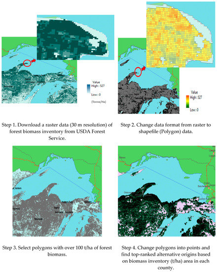 Another preprocessing step was to establish detailed origin locations for shipments. Approximately 80% of the shipments were provided with exact locational attributes (latitude/longitude or PLSS), but the remaining 20% were originated in the centroid of a county or city. A single location for numerous shipments is not representable of all forest landings within the county, so preprocessing was completed to systematically distribute the loads from the centroid to alternative locations, based on the biomass inventory data from the US Department of Agriculture (USDA) [13]. The four-step process used for creating alternative locations is outlined in Figure 1 and the number of final origins was determined based on the total volume within the county, as follows: