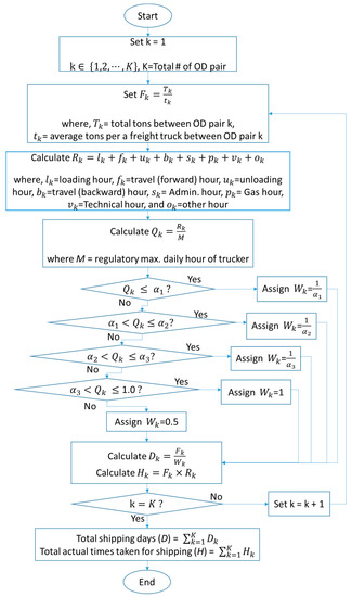 To compare the efficiency values between a truck only system and truck/rail multimodal alternative, we needed to calculate total shipping days needed to move all logs in the database and total actual times taken for truck movements. The flow chart to calculate both parameters is provided in Figure 2.