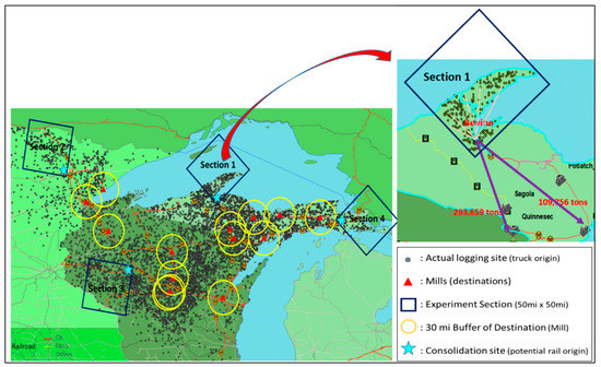 The economics of the Upper Midwest of US depends heavily on forest products industry. For the forest industry, minimizing transportation cost of raw materials is critical, due to the relatively low value and high weight of the materials. It is well known that transportation cost may account for almost half of the delivered cost of raw materials (in most cases logs) to the mill gate [1]. With origins throughout the forests and relatively short hauls, the single mode transportation by trucks has been the most prevalent mode for moving logs from logging sites (or forest landings) to the final destination (e.g., mills) in one continuous move. However, the long-term sustainability of this single mode transportation is being questioned due to the shortage of truck drivers, fluctuation of fuel prices, and changes in hours of service laws. Rail transportation has traditionally offered a safe and economical alternative for log movements from aggregation points to the mills (especially for pulp logs), but its use has been in decline over the past decades, as railroads have sought improved economics by prioritizing high-volume (min. 20 cars per block) and long-distance shipments (average rail distance in the US is over 1600 km [2]). With short average distances, a high number of origin–destination pairs, and low value, log movements do not align well with the current return of investment expectations by railroads. As a result, the rates considered adequate by larger railways are considered excessive by shippers, shifting more logs off their rails and onto trucks.