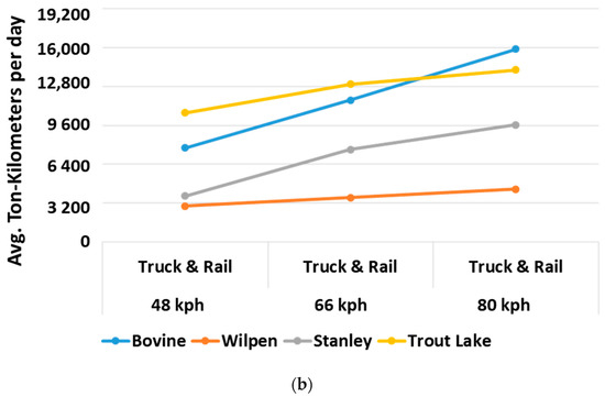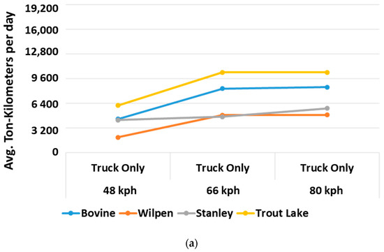 Figure 4 provides the sensitivity analysis results on the various log truck speeds for truck only and multimodal scenarios. As expected, the ton-kilometers per day increased with the increase of truck speeds (4.6% when moving from 66 to 80 km/h average speed), suggesting that increasing truck speeds would improve log truck productivity in general. However, more importantly the productivity increases were greater in the multimodal scenario (Figure 4b), which suggests that increases in truck speed had higher potential to improve the value efficiency if both truck and rail were used (22.6% in multimodal vs. 4.6% in truck only scenario). With shorter round trips, the higher speeds could be more easily converted to additional round trips while remaining within the hours of service limitations.