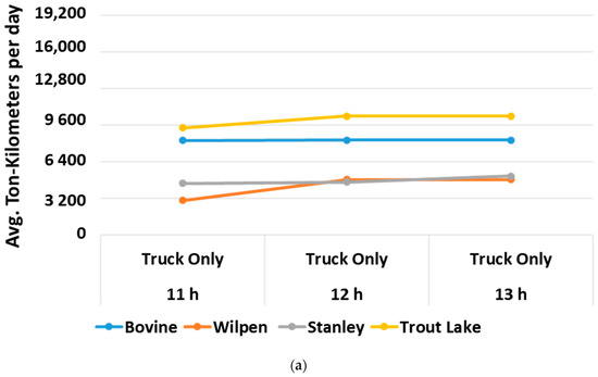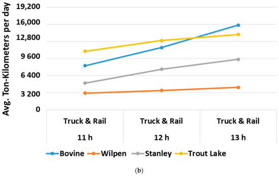 Figure 5 provides the results for the hours of service sensitivity analysis. Similar to speed, ton-kilometers per day increase with higher hours of service, but the impact is higher in the multimodal scenario (21.4% increase vs. 1.9% increase in truck only, when moving from 12 to 13 h of service; Figure 5). Just like with average speed increases, shorter trips to rail sidings make it easier to add round trip to a daily schedule.