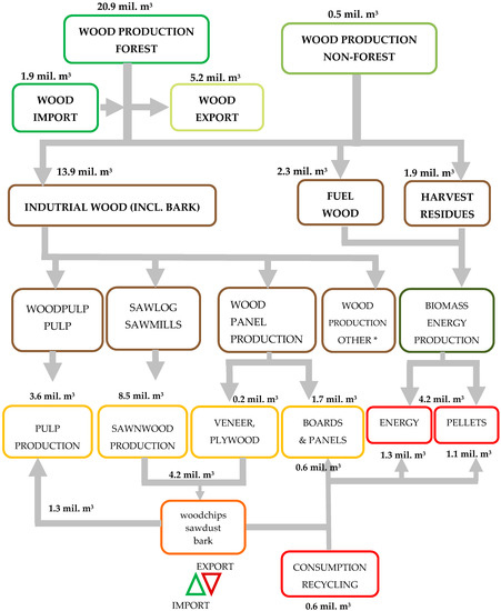 The second source of roundwood production entering wood processing comes from non-forest areas. The only currently relevant data about wood production outside the forest can be taken from the results of National Forest Inventory (NFI) II [40]. For forests there is a point estimation of 0.49 million m3/year (lower limit 0.40 million m3/year, upper limit 0.57 million m3/year). This volume is mainly processed outside the industry. It must be distinguished between how much bark and residue make it into the wood flow for material processing and how much into the wood flow for energy processing. However, this requires separate analysis and data collection that are not directly tracked at the moment.