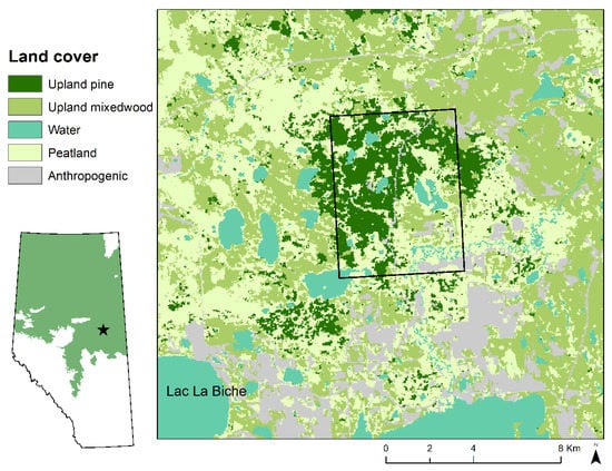 Location of study area. The study area is located north of Lac La Biche, Alberta, Canada in the south boreal transition zone (see black rectangular outline). Land cover classes modified from the enhanced wetland classification [21]. Inset map shows the extent of the boreal forest in Alberta, Canada.