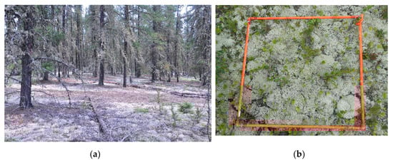 Terricolous lichen-dominated understory of a lichen woodland ecosystem in Alberta, Canada. (a) The study area consists primarily of mature (>90 years old) jack pine (Pinus banksiana) with a lichen-dominated understory. (b) Cover of lichen was visually estimated in 1 m2 quadrats.