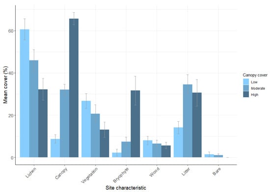Plot characteristics for 15 jack pine forest stands, each with five subplots (75 total observations) sampled in the south boreal transition zone of Alberta, Canada. Mean and standard error (error bars) of plot characteristics for low (<25% canopy cover), moderate (25% to 50% canopy cover), and high (>50% canopy cover) plots.