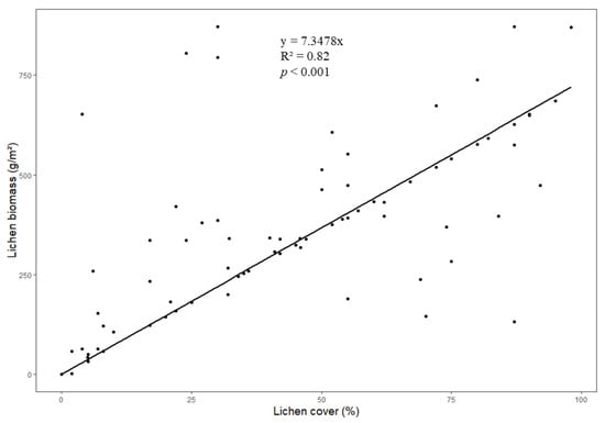Allometric relationship between lichen cover and lichen biomass. The linear relationship (regression) between lichen cover and biomass for our study area is y = 7.3478x. For every 1% increase in lichen cover, lichen biomass increases by 7.3478 g/m2.