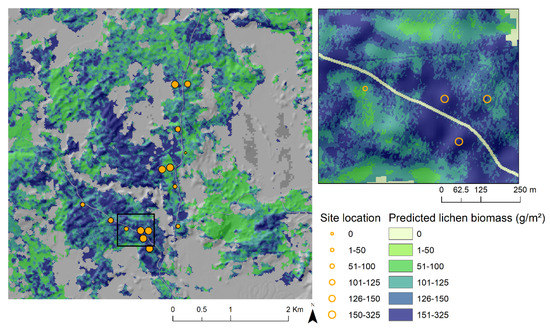 As a demonstration of the developed model, we predicted lichen biomass for our study area (Figure 5). A clear pattern of lichen abundance was observed, with areas of predicted high abundance occurring in areas where forest canopy is open and blue spectral reflectance is high.