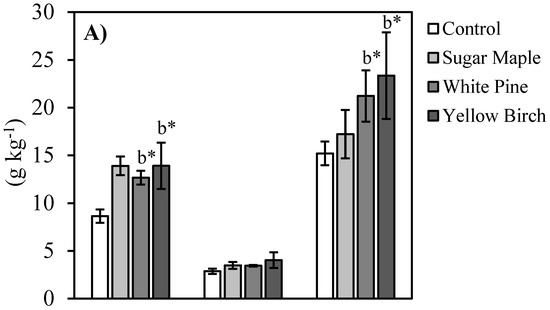Nine soil grab samples (three per horizon) were taken from each experimental plot immediately prior to application, and 3 and 12 months after ash application. Additionally, soil cores were taken from each horizon using a soil corer, mallet, and wooden block to estimate bulk density. Horizons were classified as organic (LFH), upper mineral (Ah), and lower mineral (Bm), based on the Canadian System of Soil Classification for Sombric Brunisols [49]. Soil horizon thicknesses averaged 8 cm, 15 cm, and 10+ cm and bulk densities averaged 0.38 g cm−3, 0.59 g cm−3, and 0.98 g cm−3 for LFH, Ah, and Bm horizons, respectively. Sugar maple seedlings (n = 5) were harvested from each treatment and control plot one year after wood ash additions. Soil and seedling samples were sealed in plastic bags with soil maintained around the roots for the seedlings to maximize water retention [50] and stored at 4 °C prior to analysis.